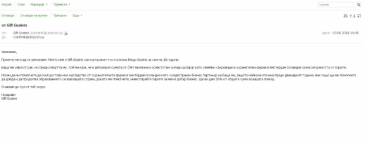 Новата схема е свързана с оставено наследство в Холандия на сирак. На лош български език е изпратено следното съобщение: