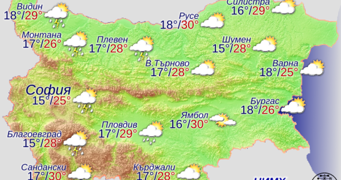 Днес преди обяд над по-голямата част от страната ще преобладава слънчево време, над Западна България с временни увеличения на облачността. Около и след обяд отново на места в Западна и Централна България ще има краткотрайни валежи и гръмотевици, интензивни ще са явленията главно в планинските райони. Остават условията за градушки. Над Източна България ще преобладава слънчево време с временни увеличения на облачността, но без валежи. Ще духа слаб до умерен североизточен вятър. Температурите слабо ще се понижат и преобладаващите максимални ще бъдат между 25° и 30°.
