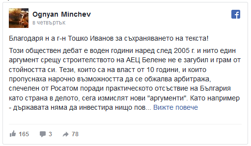Този обществен дебат е воден години наред след 2005 г. и нито един аргумент срещу строителството на АЕЦ Белене не е загубил и грам от стойността си.