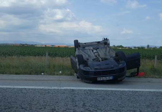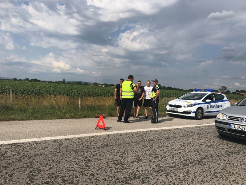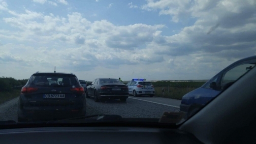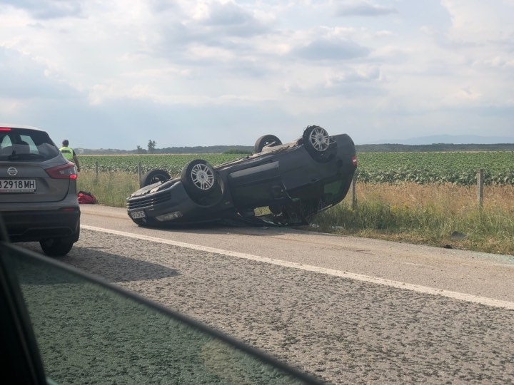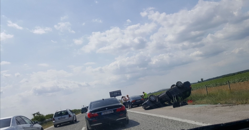 Лек автомобил „Фиат“ със софийска регистрация е по таван, докато до нея има спрял друг автомобил. Вероятно колата е спукала гума, защото на задната дясна страна се вижда само джантата. Заради катастрофата вече се е образувало ужасно задръстване от около 20 км. Част от магистралата е в ремонт и се пътува само в едното платно, а с тази катастрофа е още по-зле.
