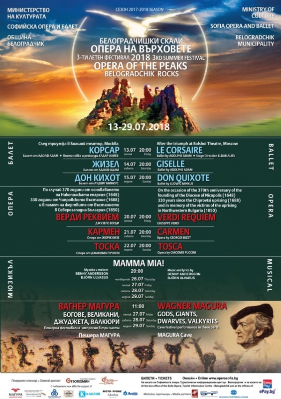 Фестивалът в Белоградчик ще се проведе от 13 до 29 юли. Оперният фестивал ще започне с три балетни постановки на 13, 14 и 15 юли- "Корсар", "Жизел" и "Дон Кихот". В следващите петък, събота и неделя (20, 21 и 22 юли) ценителите на оперното изкуство ще могат да чуят "Реквием" на Верди, както и "Кармен" и "Тоска". Последната седмица (от 26 юли) постановки ще има в четвъртък, петък, събота и неделя. Зрителите ще могат да видят мюзикъла "Мама мия" по песни на АББА.