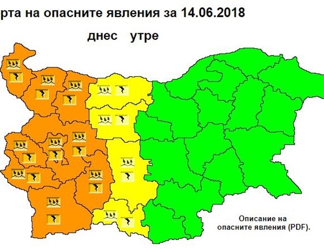 В районите с оранжев код ще има краткотрайни, временно интензивни валежи, придружени с гръмотевична дейност и силни пориви на вятъра, на места ще има и градушки. Очакваните количества на валежите са около 30-50 л/ кв.м, в планинските райони и повече.