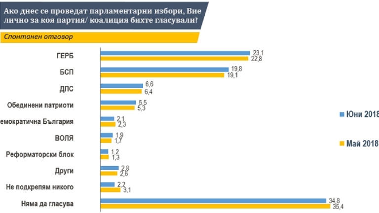 Структурата на предпочитанията се запазва сходна вече повече от година. Двата големи опонента събират гласовете на по-малко от половината избиратели. Трета сила е ДПС с близо 7 на сто електорат. “Обединени патриоти” ги следват с 5,5% подкрепа. Тези са и четирите партии, които влизат в юнския парламент.