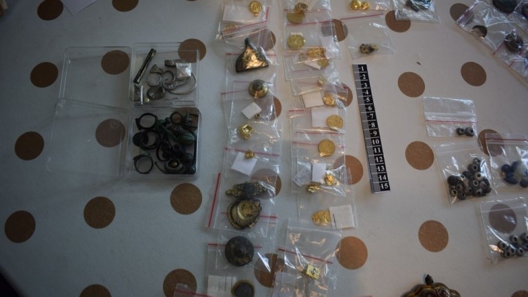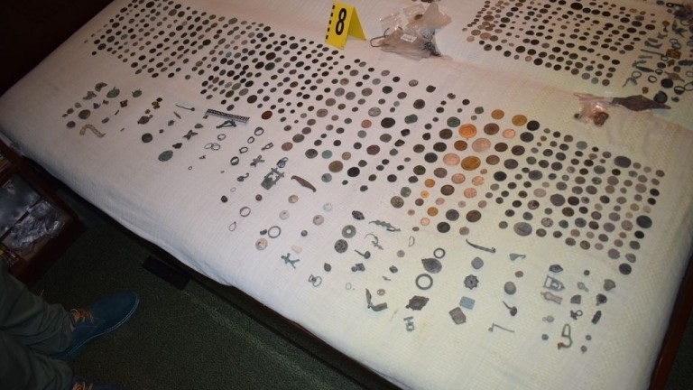 От адреса криминалистите иззели 1680 антични монети - колекции и отделни монети от тракийски, римски и византийски епохи, 431 старинни антични предмети, 49 различни по вид и форма антични предмети от жълт метал, наподобяващ злато, и античен керамичен съд.