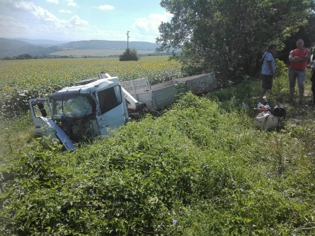 По първоначални данни товарният автомобил спукал гума, шофьорът загубил контрол и се ударил в пътнически микробус с видинска регистрация. И двете превозни средства излетели в канавката.