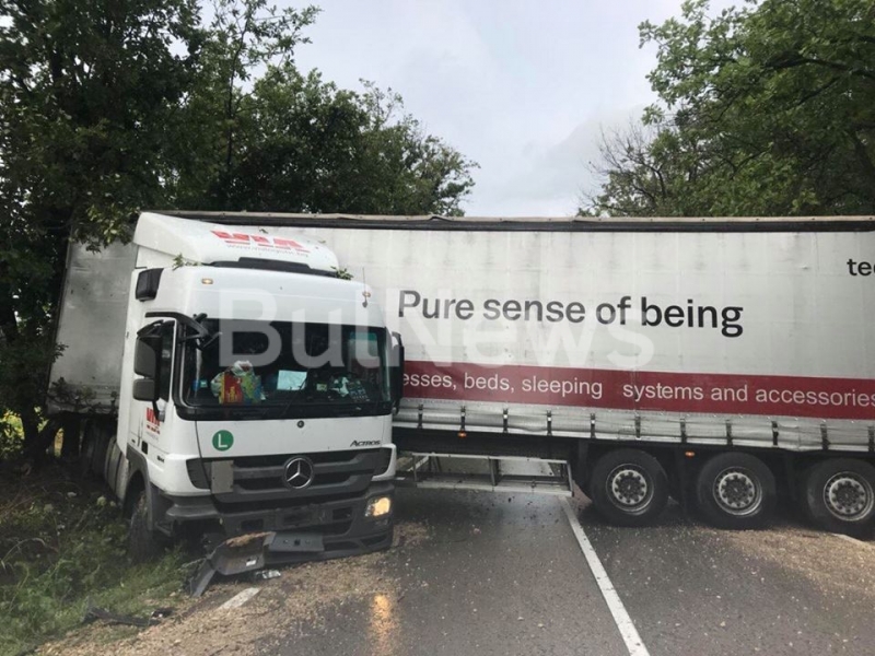 Катастрофа с ТИР е затворила международния път Е-79 между Монтана и Видин, видя първо репортер на агенция BulNews.bg. Тежката машина с българска регистрация е пътувала в посока Дунав мост 2, когато по неустановени на този етап причини се завъртяла на мокрия асфалт и преградила шосето с ремаркето си. Инцидентът е станал малко преди Димово.