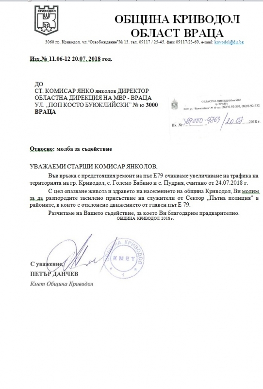 С цел опазване живота и здравето на населението на община Криводол, Ви молим за да разпоредите засилено присъствие на служители от Сектор „Пътна полиция“ в районите, в които е отклонено движението от главен път Е 79.