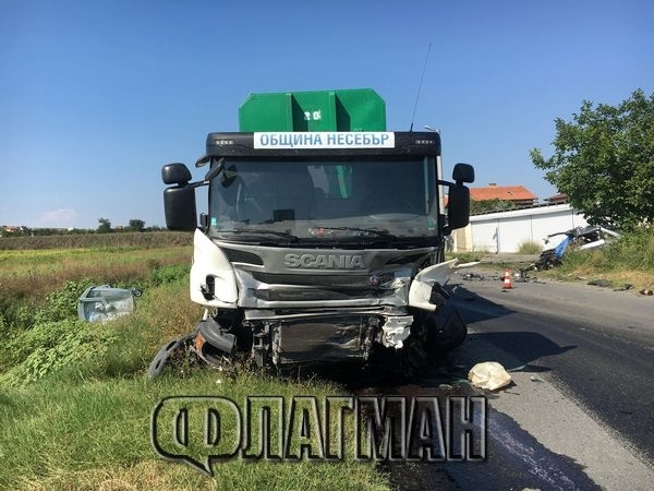 Днес следобед лек автомобил Ауди А6 предприема рисково изпреварване и се забива челно в боклукчийки камион на Община Несебър. Инцидентът стана на пътя Бургас-Каблешково, на входа на с. Лъка.
