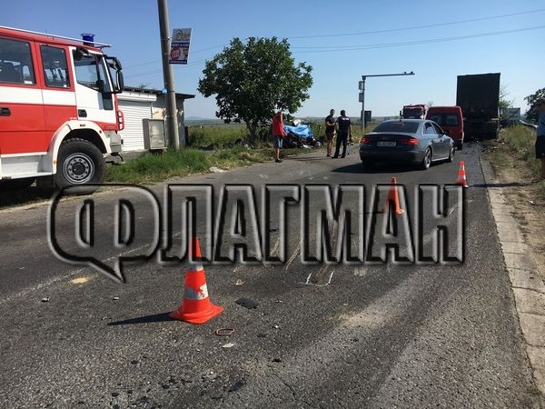 Загиналите са трима - съпруг, съпруга и дъщеря им, научи Флагман.бг от отлично информирани източници. Семейството е от Хасково и е било на почивка по Южното Черноморие. Пътувайки в посока Каблешково, шофьорът тръгнал да изпреварва дългата колона от автомобили с бясна скорост. При удара със служебния камион немският автомобил се завъртял по шосето и се забил в крайпътно дърво. Сблъсъкът е бил толкова жесток, че телата на тримата загинали буквално били разчленени. Бащата зад волана целият бил потрошен - със счупени ръце, крака и глава. От удара на стомаха в кормилото са изскочили вътрешностите му, разкриха още полицаи, присъствали на огледа.