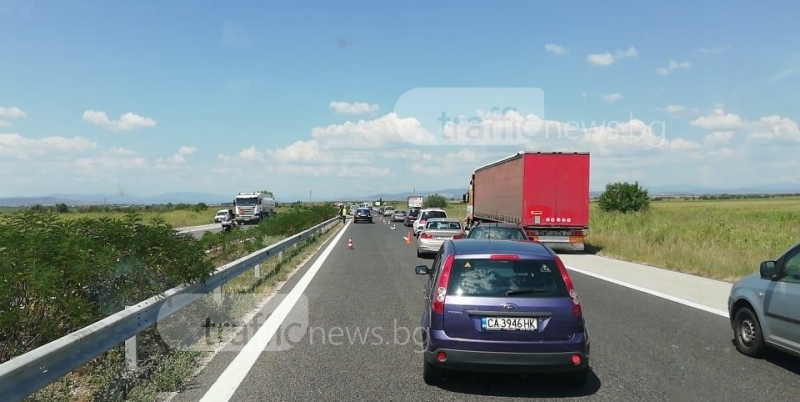 Инцидентът е станал между 94 и 95-километър на магистралата. Колата е смачкана почти до неузнаваемост, а на мястото на инцидента вече има екип на пътна полиция. Шофьорът на "Корса"-та и придружаващ го с него пътник са пострадали. Единият е прегледан на място от екип на Бърза помощ, а другия е откаран с линейка в болница за цялостен преглед. Шофьорът на микробуса с френска регистрация не е пострадал. Движението се извършва в едната лента, а екип на полицията регулира преминаващите автомобили.