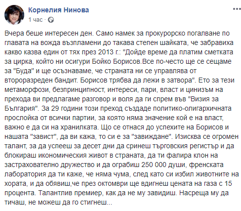"Само намек за прокурорско погалване по главата на вожда възпламени до такава степен шайката, че забравиха какво казва един от тях през 2013 г.: "Дойде време да платим сметката за цирка, който ни осигури Бойко Борисов. Все по-често ще се сещаме за "Буда" и ще осъзнаваме, че страната ни се управлява от второразреден бандит. Борисов трябва да лежи в затвора".