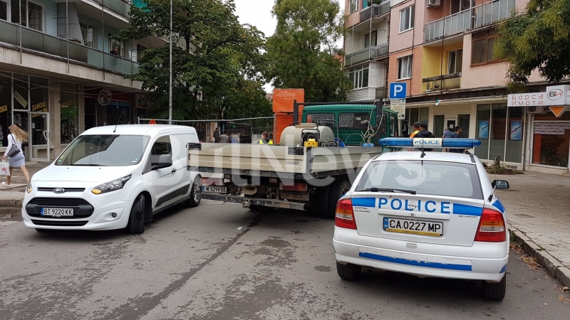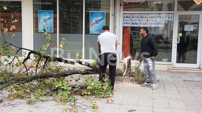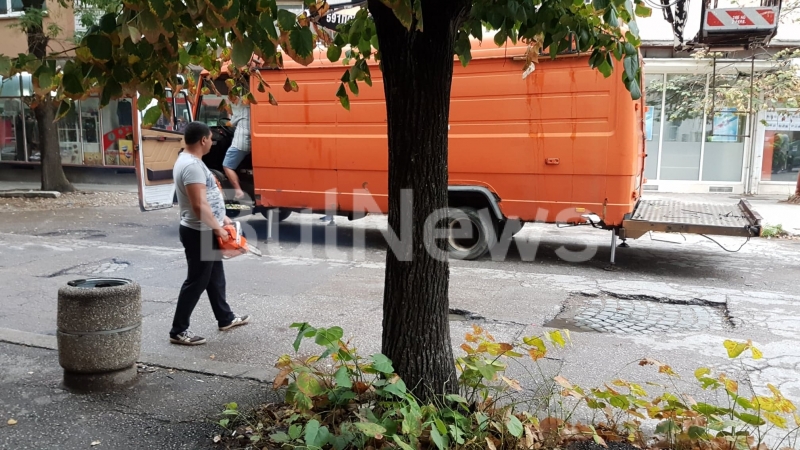 От сутринта въпросната улица е блокирана и около 10-ина мъже се опитват да изрежат всички дървесни видове под зоркото наблюдение на главния архитект на община Враца Чавдар Спасов.