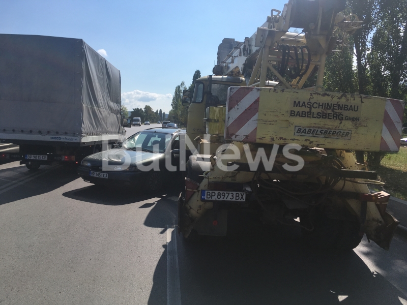 Катастрофа между кран и лек автомобил е станала преди минути на натоварения булевард „Васил Кънчов“ във Враца, видя първо репоретр на агенция BulNews.bg. Машината, която е собственост на „Топлофикация“, е завъртяла колата и я е влачила 10 метра.