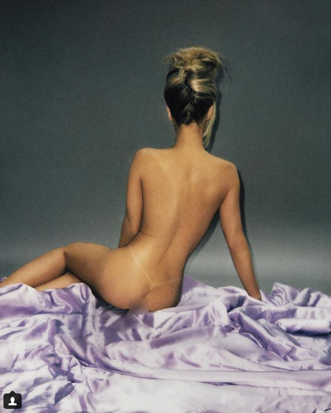 Тя е чисто гола, единствено по грим и дори косата ѝ не прикрива уникалната ѝ фигура. Заела е предизвикателна поза върху сатенен лилав чаршаф, а разликата от тена ѝ залъгва погледа ви, че има бельо. Горещите кадри са дело на фотографа Ели Ръсел Линец, който е майстор на актовите снимки. Неведнъж е заснемал и кралицата на скандала Лейди Гага.