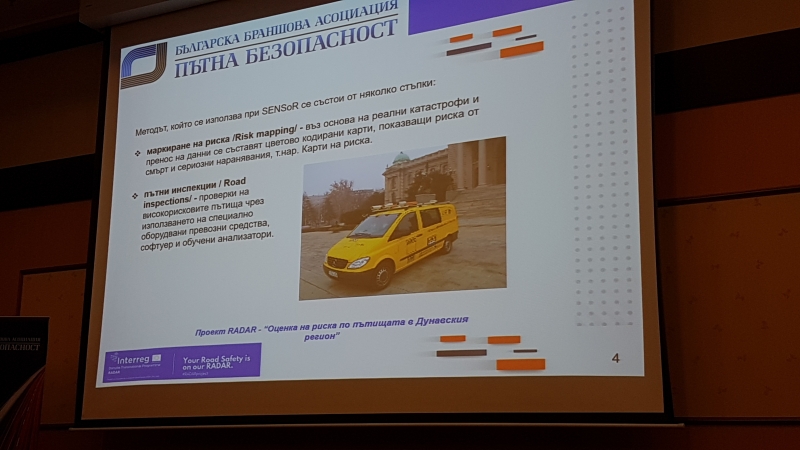 През първия ден от семинара участниците имаха възможността да се запознаят с проект RADAR – „Оценка на риска по пътищата в Дунавския регион“. Лекцията бе изнесена от д-р Николай Иванов, който е председател на браншовата организация. Инж. Росица Спасова пък представи какви отдити и инспекции трябва да се правят на пътищата преди да бъдат пуснати в експлоатация. Спасова подчерта, че именно тези независими инспекции, извършени от специализирани одитори, ще подобрят значително пътната безопасност и няма да ставаме свидетели на безумни изпълнения от страна на някои строителни фирми, които могат да костват човешки животи.