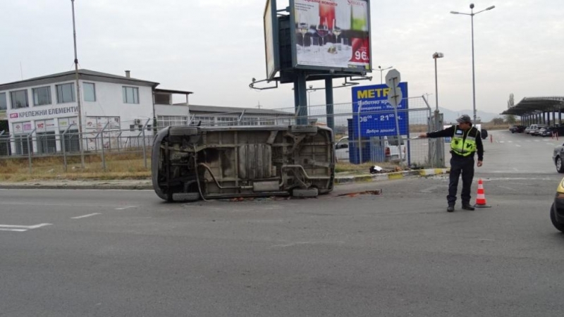 "Мерцедес"-ът е паднал на дясната си страна в лентата към Благоевград, патрул на КАТ-Пътна полиция регулира движението.