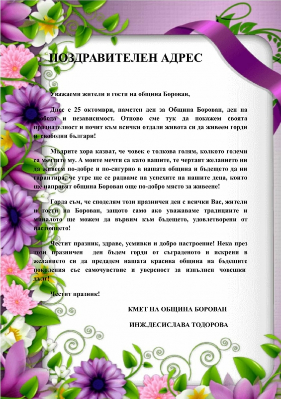 Горда съм, че споделям този празничен ден с всички Вас, жители и гости на Борован, защото само ако уважаваме традициите и миналото ще можем да вървим към бъдещето, удовлетворени от настоящето!