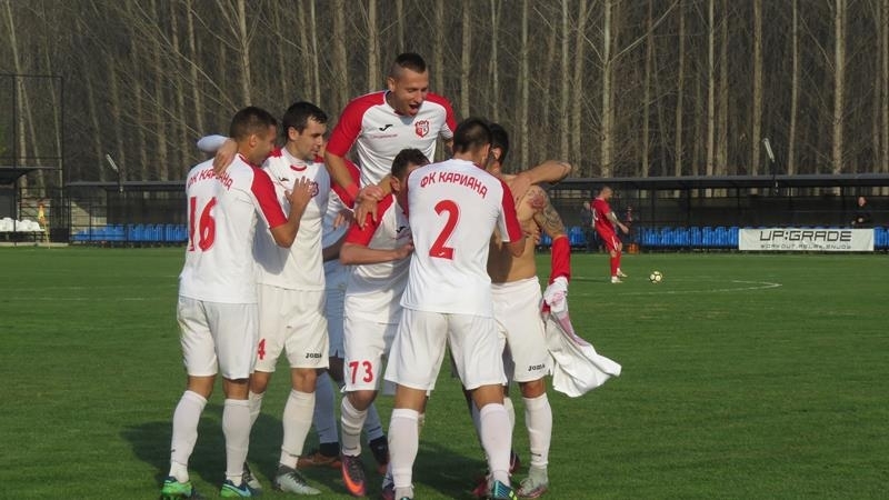 В 18-та мин. Божидар Кацаров бе оставен непокрит в пеналта, но стреля високо над вратата. Карианци направиха няколко добри контраатаки, при една от които Янислав Иванов нахлу вляво в наказателното поле, освободи се от защитник и останал очи в очи с вратаря реши да подава вместо да бие и сгреши. В 33-та мин. Ивелин Илиев проби от дясно, литна футболист на гостите и с левия крак изпрати топката в далечния ъгъл на Росен Андонов и "Кариана" поведе.