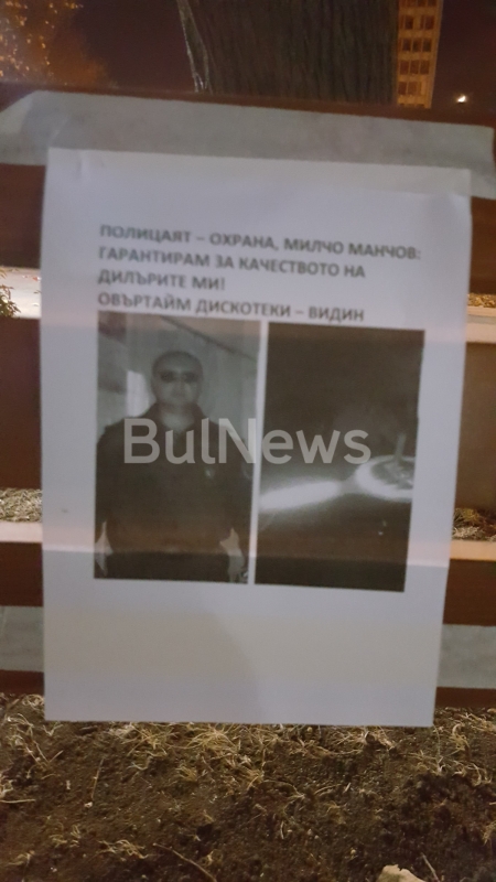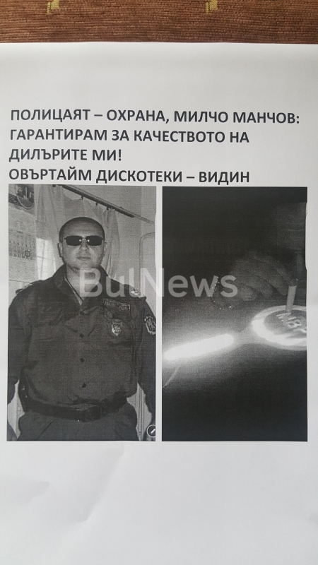 На плакатите с големи букви е изписано: „Полицаят – охрана Милчо Манчов: Гарантирам за качеството на дилърите ми! Овъртайм дискотеки – Видин“. Под надписа пък има две снимки, едната от които е на въпросния униформен, а на другата се вижда полицейска стоп палка, от която според автора на плакатите Манчов шмърка наркотици.