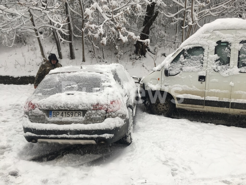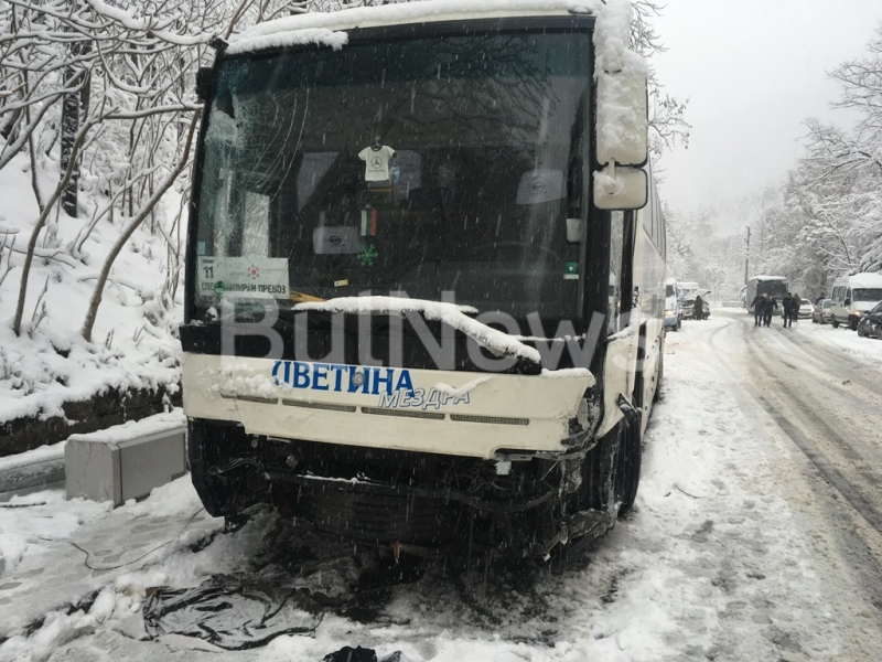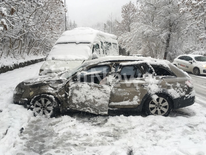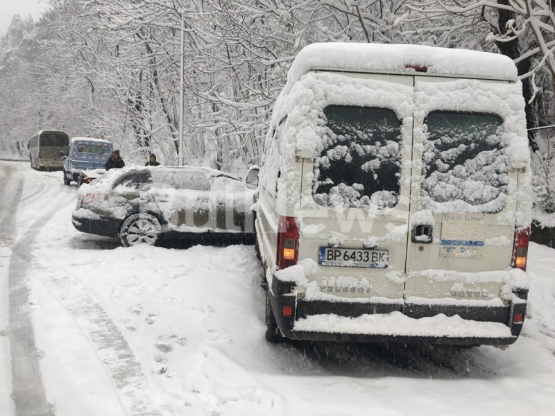 Снежната обстановка във Враца вече предизвика първата катастрофа. Кола се завъртя и се удари в два автобуса на пътя за село Згориград, видя първо репортер на агенция BulNews.bg.