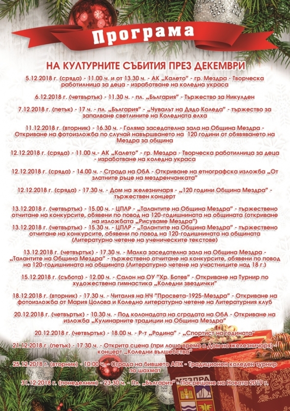 Община Мездра публикува програмата със събитията, които е подготвила за предстоящите празници. Тя започва с творческа работилница за деца в комплекс "Калето" и търчежество за Никулден през деня на 6 декември. На 7 декември ще бъдат запалени светлините на коледната елха в железничарския град, а празничните прояви ще продължат чак до 31 декември, когато на площад "България" мездренчани ще се съберат да посрещнат Нова година.