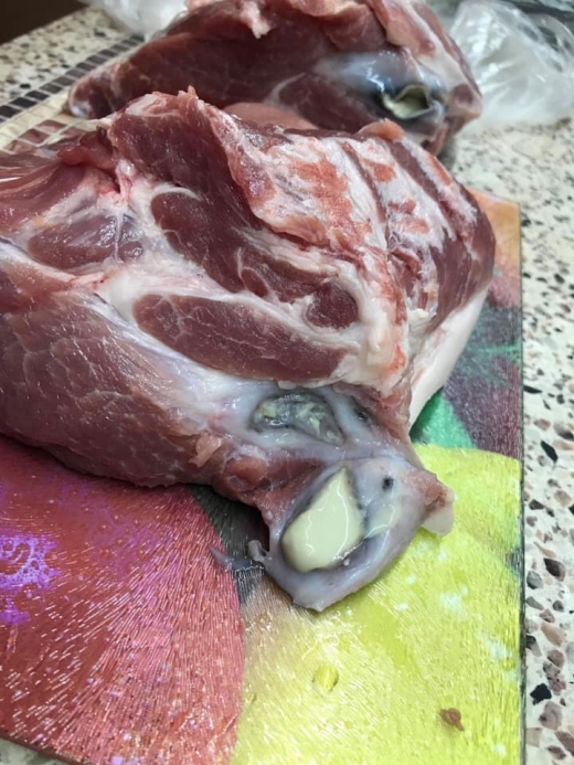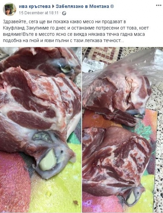 "Здравейте, сега ще ви покажа какво месо ни продават в Кауфланд. Закупихме го днес и останахме потресени от това, коет видяхме! Въте в месото ясно се вижда някаква течна гадна маса подобна на гной и язви пълни с тази лепкава течност", пише потърпевшата монтанчанка.