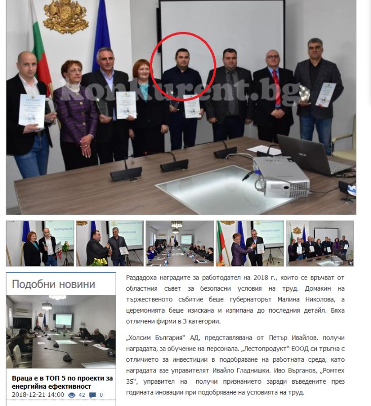 Най-изненадващо сред споменатите в материала имена на коректни фирми е пропуснато това на „Инекс трейд“ ЕООД, собственост на младия бизнесмен Илиан Цветков. Дружеството получи приз „Работодател на 2018“ за инвестиции за безопасна работна среда, като наградата бе връчена от заместник областния управител Робертино Маринов. Фирма „Инекс Трейд“ работи в сферата на качественото строителство и е специализирана във всички видове дейности, които са свързани с високото и ниско строителство, всички фази на изграждането на обекта от неговото проектиране до въвеждане в експлоатация на готовия обект. През изминалата година тя изпълни и редица знакови ремонти, сред които и този на сградата на община Враца.