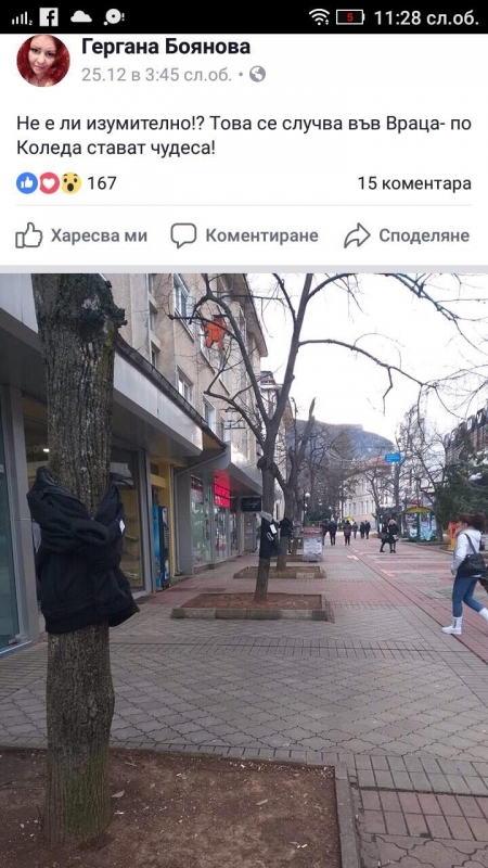 Инициативата бе на „Мис Враца 2014“ Александра Цветкова, която имаше за цел да помогне на бездомните и нуждаещите се от топлина. На 25 декември врачанката и още шестима доброволци, отзовали се на призива й, облякоха дърветата от площад “Македония” до Сувенирната палата в града.