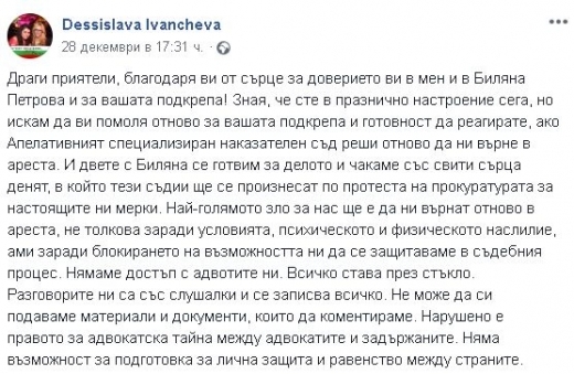 „Драги приятели, благодаря ви от сърце за доверието ви в мен и в Биляна Петрова и за вашата подкрепа! Зная, че сте в празнично настроение сега, но искам да ви помоля отново за вашата подкрепа и готовност да реагирате, ако Апелативният специализиран наказателен съд реши отново да ни върне в ареста“, това написа в личния си фейсбук профил преди дни бившата кметица на столичния район „Младост“ Десислава Иванчева, която на 22 декември излезе под домашен арест.