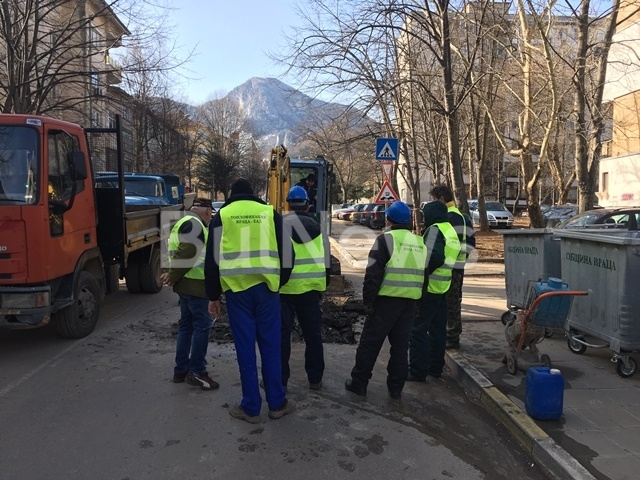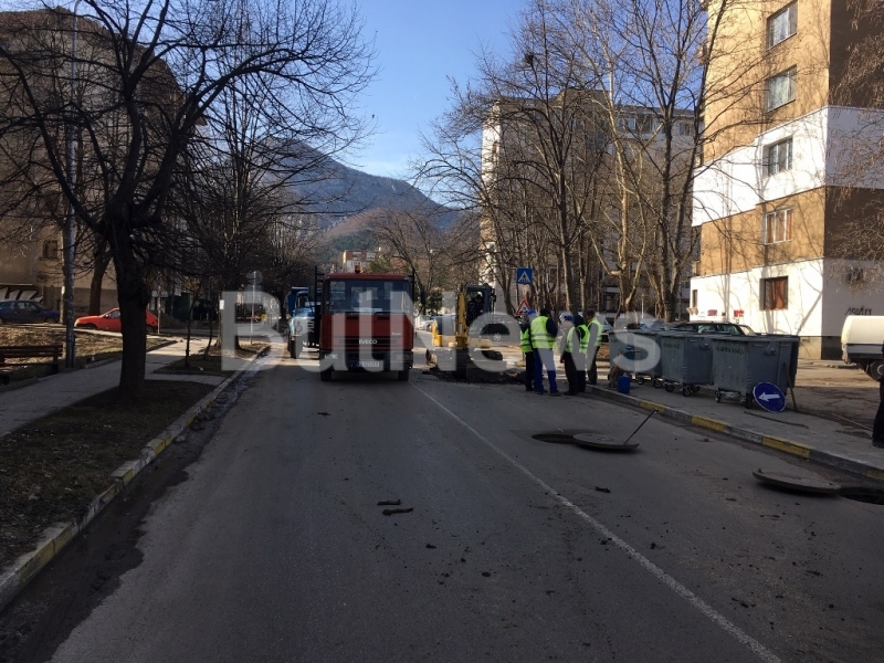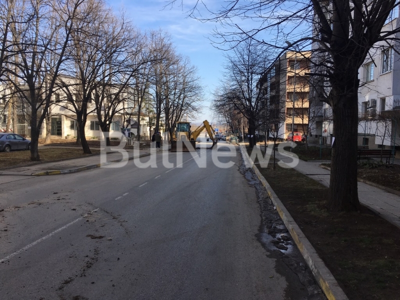 Днес преди обед екипи на дружеството затвориха ул. „Екзарх Йосиф“, заради авария, която се отстранява от работници. На място пристигна и голямата машина, която разби настилката на едно от малкото шосета със здрав асфалт.