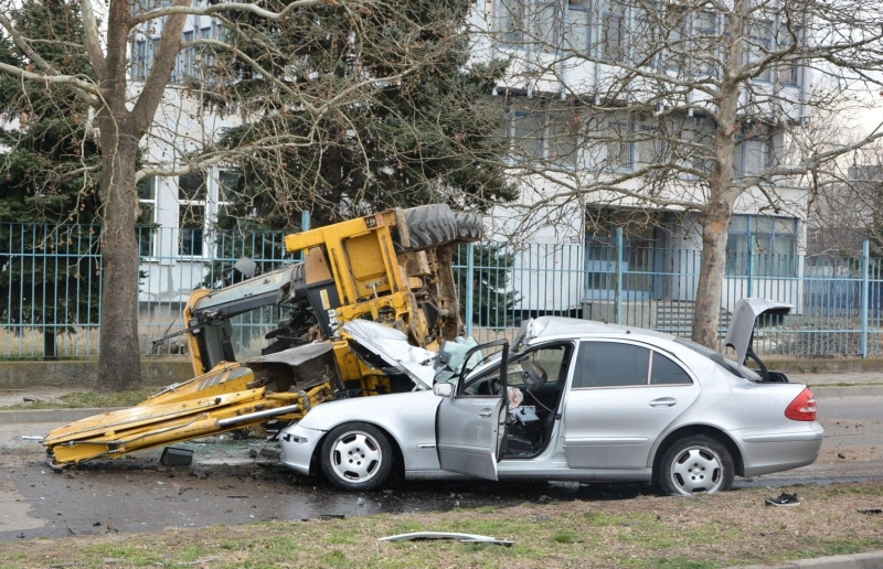 Лек автомобил "Мерцедес" се удари в багер и го преобърна в Харманли.