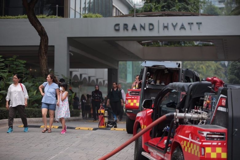 Телевизионните кадри показаха гъст черен дим, който се издигаше от хотел Grand Hyatt близо до търговския район Orchard Road, но Сингапурските сили за гражданска защита (SCDF) заявиха, чепожарът е бил бързо изгасен.Възникналият пожар бил загасен от инсталираните по таваните противопожарни пръскачки преди да пристигнат пожарникарите.