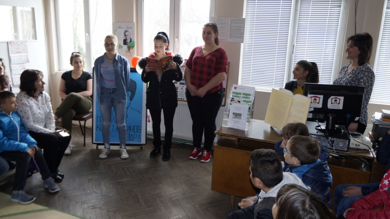 Ученици от X и XI клас на ПГ „Ал. Константинов“ с ръководител Силвия Нецова поведоха децата от IV клас при ОУ „Св. св. Кирил и Методий“ по стъпките на герои от приказката „Къщовник“ от сборника „Приказки с поука“. Четвъртокласници разказаха по роли приказката „Зеленчукова фамилия“ от Радой Киров, за да зарадват и благодарят на своите по-големи приятели за прочетеното. Децата представиха свои любими книжки. Изказаха впечатленията си от тях и прочетоха интересни пасажи. Ръководители на малките ученици бяха Цветелина Димова и Росица Гълъбова. Кратката среща създаде трайни приятелства с помощта на книгата.