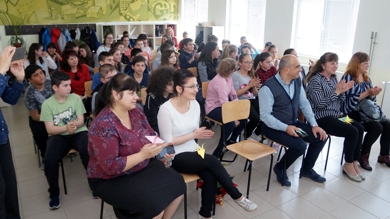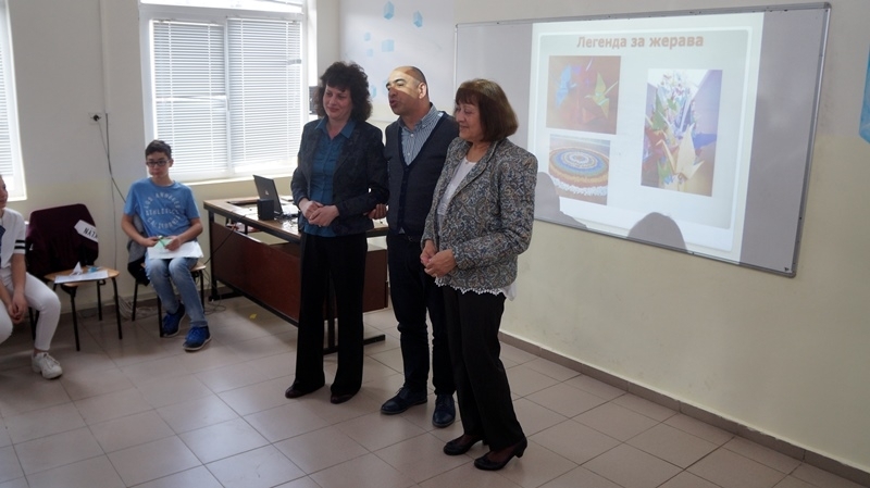 В любимия на много ученици от училището кабинет 303, изграден и обогатен с различни сбирки от природния свят от уважавания преподавател по биология (вече пенсионер) г-жа Лилия Коловска, се проведе интересна среща. Г-жа Коловска чрез презентация и беседа поведе младите природолюбители от VI “А“ и VI “Б“ клас с преподавател по биология Галя Петкова по приказния път на жеравите. Раздаде на децата символични хартиени жерави за здраве и късмет и сподели с присъстващите думите на Бърнард Шоу: „Научихме се да летим в небето – като птици. Научихме се да плуваме в океана – като риби. Сега остана да се научим да живеем на земята – като хора.“