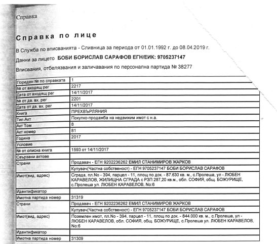 Както споменахме, купувач е Боби Борислав Сарафов – син на Директора на Националната следствена служба и заместник главен прокурор Борислав Сарафов. Продавач обаче е Емил Станимиров Жеков – син на разследвания от Борислав Сарафов в края на 90-тте години и в началото на века и осъждан бизнесмен Станимир Жеков.