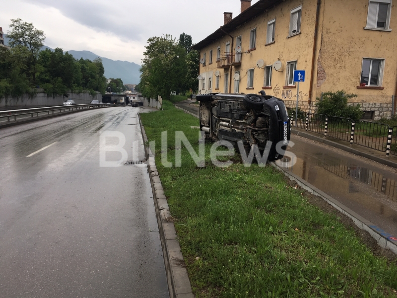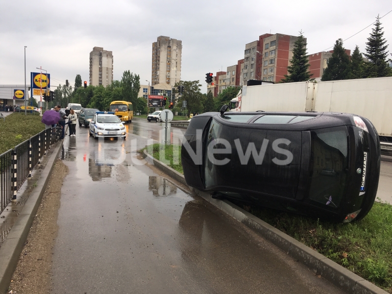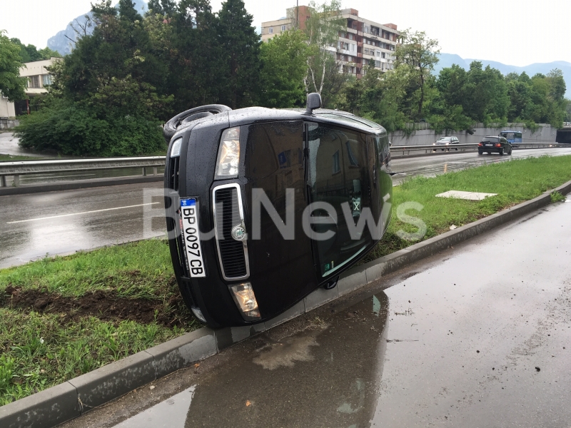 Инцидентът е станал преди броени минути. Лек автомобил "Шкода" с врачанска регистрация, шофиран от жена, идвал откъм ул. "Екзарх Йосиф". На светофара шофьорката завила наляво в посока подлеза. От дъжда обаче асфалтът бил хлъзгав и тя загубила контрол над волана. Колата изхвърчала в тревна площ в дясно от шосето и се преобърнала на една страна.