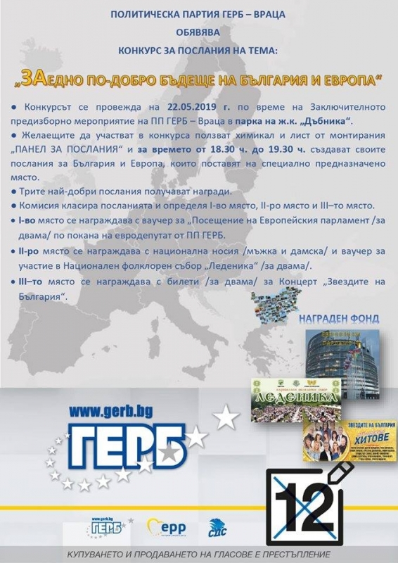ПП ГЕРБ – Враца кани жителите и гостите на града на концерт с участието на Силвия Кацарова на 22 май 2019 г. от 19.00 ч. в парка на ж.к. „Дъбника“ за закриване на кампанията за Европейски избори 2019.
