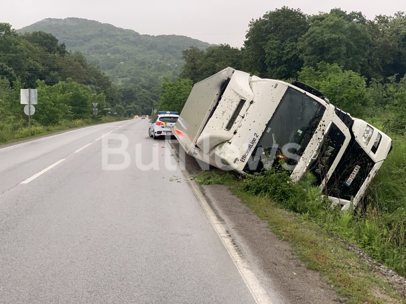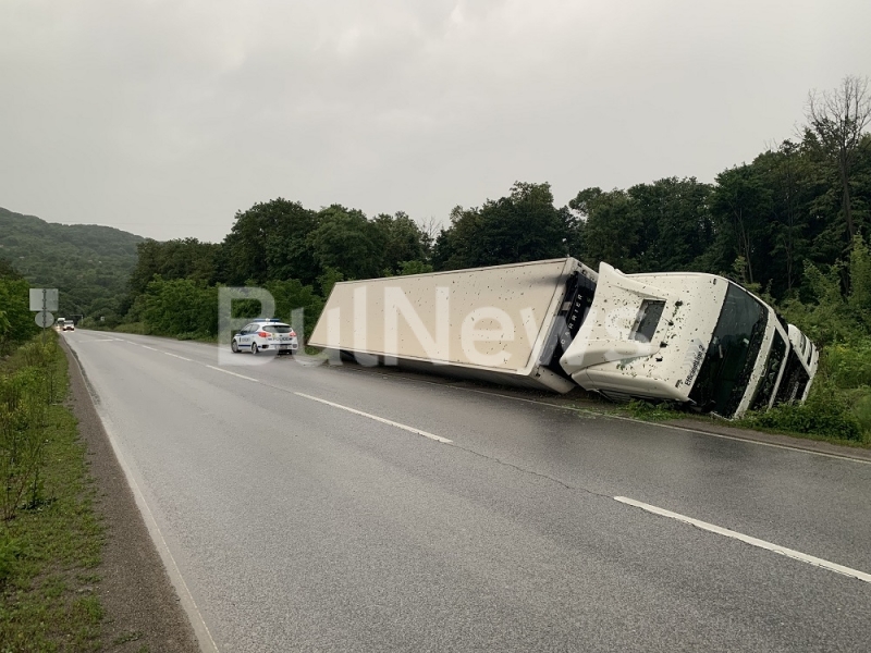 Видински ТИР е катастрофирал преди минути на обхода на Враца, видя първо репортер на агенция BulNews.