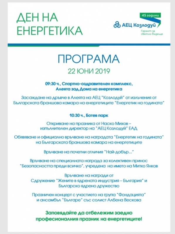 На 22 юни АЕЦ „Козлодуй“ отбелязва Деня на енергетика. Програмата по традиция започва при Спортно-оздравителния комплекс в града, където отличеният за „Енергетик на година“ ще засади поредното дръвче в Алеята на АЕЦ.