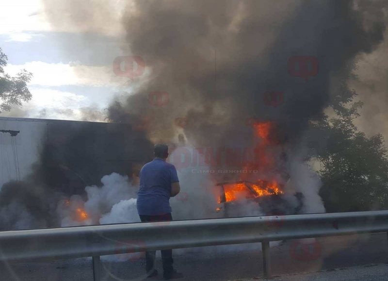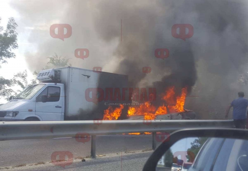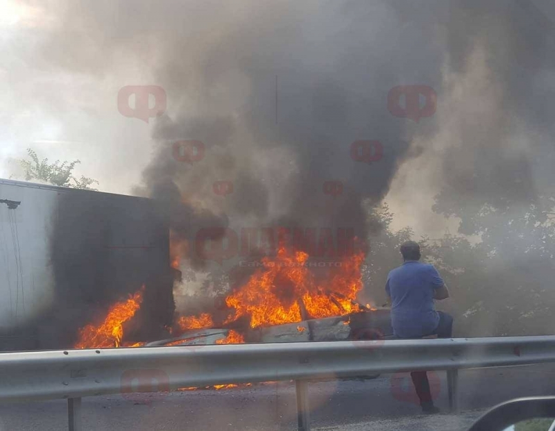 При сблъсъка колата се е запали, а огънят погълна и тежкотоварния автомобил, натоварен с хранителни стоки.