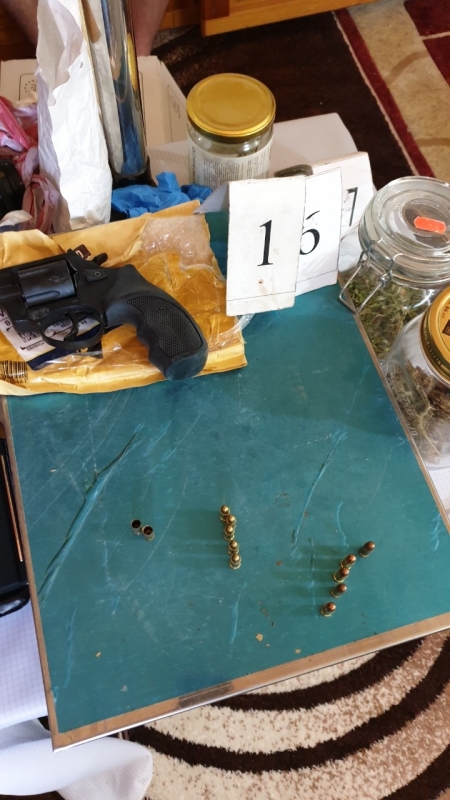 Над окачен таван от дървени летви криминалистите намерили укрити пистолет – револвер със срязана цев и заличен сериен номер, 163 патрона от различен калибър и 14 гилзи. От къщата са иззети още мобилни телефони и сим карти.