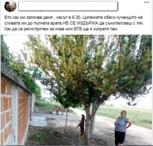 „Ето как ми почва денят. Часът е 6.30. Циганката обеси кученцето на сливата до пътната ми врата. Не се издържа съжителството с тях”, пише жена, която живее в съседство с ромката извършителка на жестокостта.