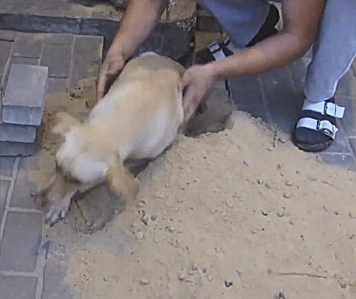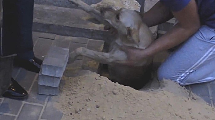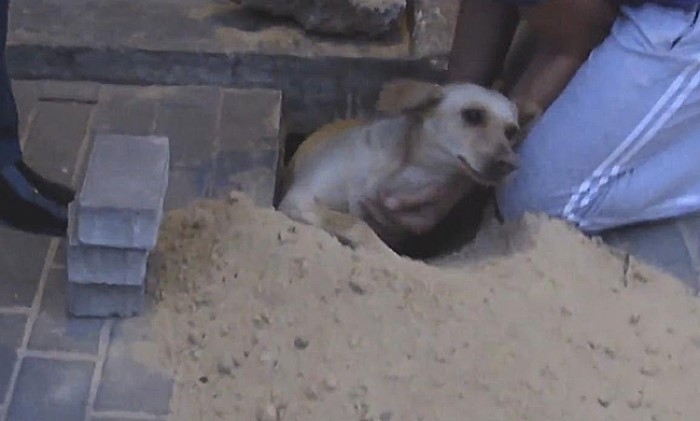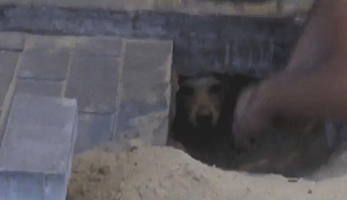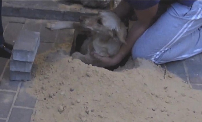 Когато човекът ги махнал, звуците само се усилили. Накрая можело да види муцуната на куче. Животното не можело да премине през дупката. Кучето е било бременно и затова му трябвало повече пространство. След като разширил дупката малко повече, мъжът успял да освободи четириногото.