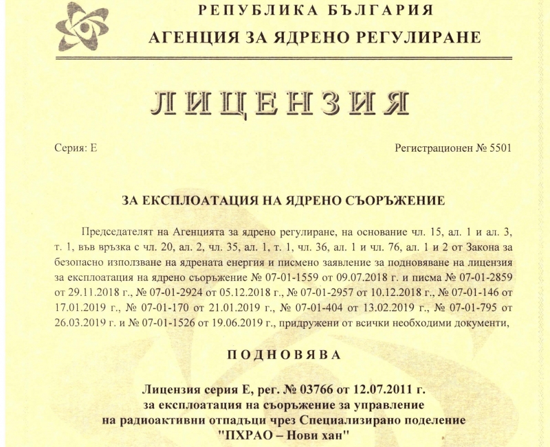 За да бъде успешно подновена лицензията, екип от около 10 експерта от СП „ПХ РАО – Нови хан“, са работили в рамките на една година – за актуализация на документи и за създаване на нови в съответствие с развитието на нормативната уредба в областта на ядреното законодателство.