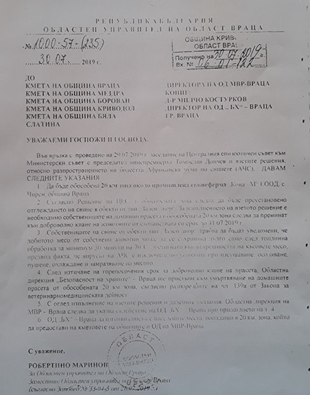 Заповедта е изпратена до кметовете на Враца, Мездра, Бяла Слатина, Криводол и Борован. В нея зам.-областният управител разпорежда да се съобщи на стопаните, че срокът на мярката за доброволно клане на животните изтича на 31-ви юли. След тази дата ще се пристъпи към умъртвяване на свинете от компетентните органи – ОДБХ – Враца.