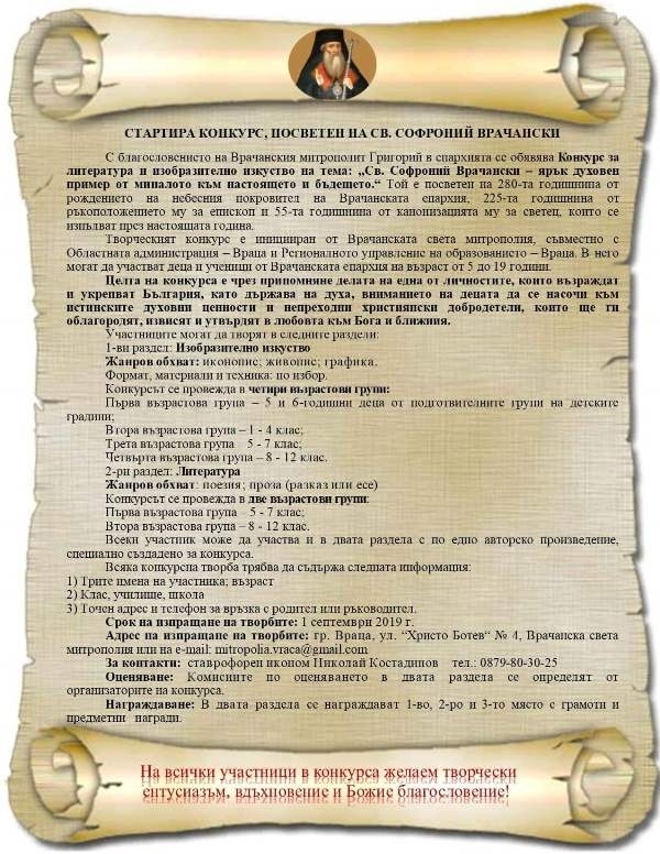 Врачанският митрополит Григорий посрещна във Възнесенския храм „Св. Софроний Врачански“ децата от будителската работилница, посветена на светеца - покровител на епархията. Инициативата се организира за трети път през лятната ваканция от Регионална библиотека „Христо Ботев“ във Враца съвместно с Врачанската света митрополия. Десетки деца от града и квартал Бистрец, селата Паволче и Чирен, детските градини „Слънце“ и „Детски свят“, НУ „Св. Софроний Врачански“ и техни гости от Франция, както и млади читатели изпълниха старинната църква с усмивки и любопитство. Как е подобващо да се държим в храма, защо го посещаваме и запалваме свещичка, кога и как се прекръстваме - бяха част от въпросите, по които митролит Григорий беседва с малчуганите. Владиката им показа икона на св. Софроний Врачански, разказа за будителското му дело и открои значимостта на небесната му закрила за епархията.