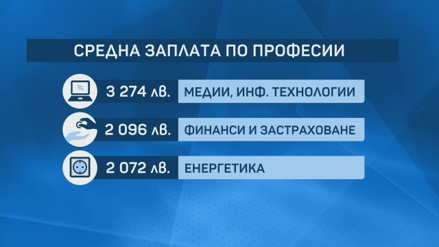 Статистиката показва и каква е средната заплата по професии. 3274 лева е в сектор медии и информационни технологии. 2096 лева в сектор финанси и застраховане, и 2072 лева в енергетиката.