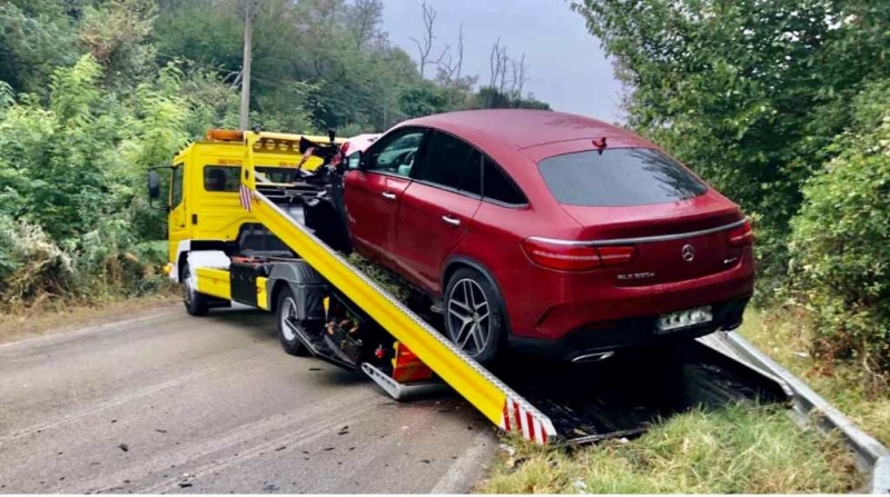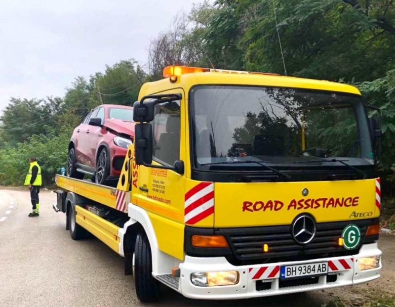 Нанесени са обаче сериозни материални щети по „Мерцедес“-а. Предницата му е смазана, предната лява гума липсва. Щети по автовоза няма.