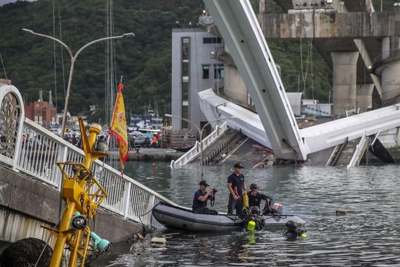 Вчера дългият 140 метра аркообразен мост рухна върху залив на източния бряг на Тайван, на около 60 км югоизточно от столицата Тайпе. Преди това островът беше връхлетян от тайфун, но когато мостът се срутил, времето било слънчево и не е ясно дали бурята е била фактор.