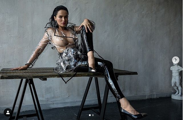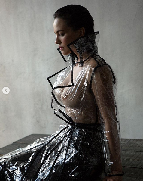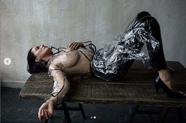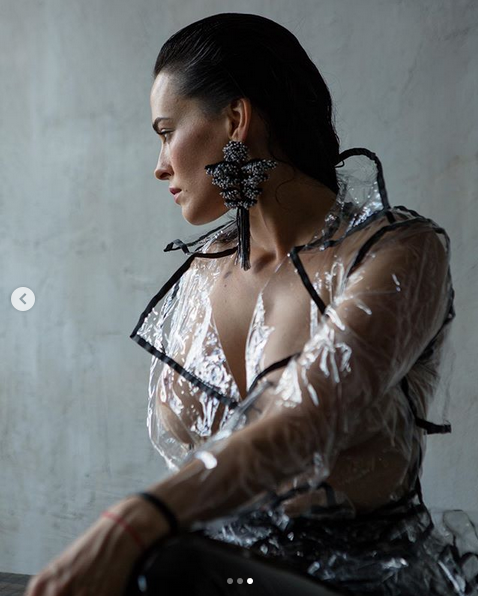 Даша позира без сутиен в прозрачен дъждобран, като на кадрите се вижда разкошният й бюст с впечатляващи размери. Дръзката й визия се подчертава перфектно и от панталоните и обувките с висок ток. Косата е гладко разположена назад, гримът е естествен. Красавицата позира на маса - тя седи грациозно върху дървената повърхност. "Говоря малко. Повече чувствам и преживявам. Но вие питайте. Аз съм наблизо", написа Даша Астафиева към фотографиите.